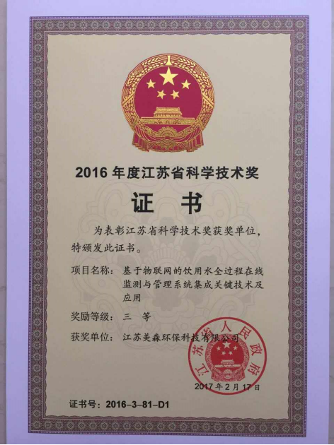 近日,全省科學技術獎勵大會落下帷幕,向全省優秀企業頒發省科學技術獎,常州市僅16家獲獎,美淼環保位列其中,獲此殊榮。獲獎的“基于物聯網的飲用水全過程在線監測與管理系統集成關鍵技術及應用”是美淼智慧水務系統的核心技術。